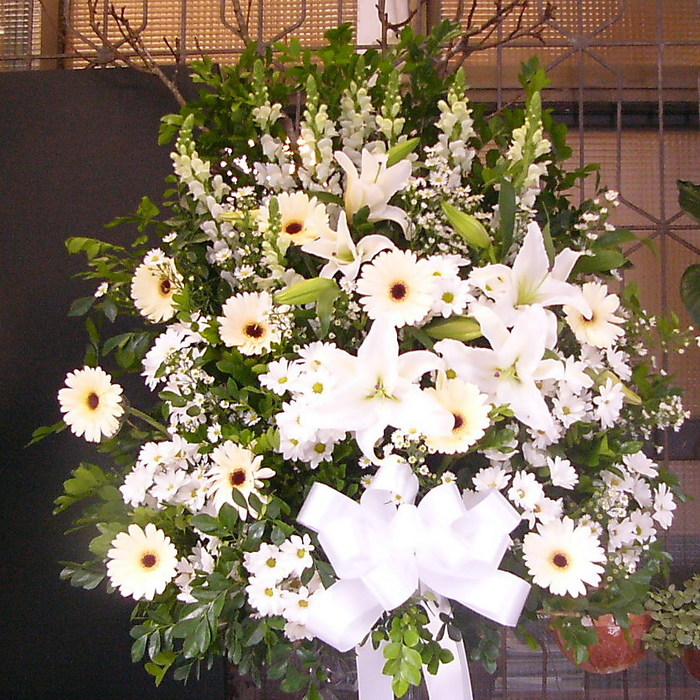 〔使用花材〕 太陽花 小白菊 香水百合 桔梗 白孔雀 白金魚草 〔花禮尺寸〕約高210 CM 寬80 CM ●〔訂購方式〕網站線上訂購 電話0937157689 LINE: ID9330970 ● 圖中花材因季節缺貨時我們將以同質等花卉替代設計 ● 請在預定送花日前2天完成訂購.付款手續