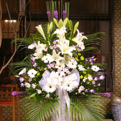 〔使用花材〕鐵炮百合 香水白合 蒲葉 太陽花 桔梗 綠小菊 繡線花 〔花禮尺寸〕約高210 CM 寬80 CM ●〔訂購方式〕網站線上訂購 電話0937157689 LINE: ID9330970 ● 圖中花材因季節缺貨時我們將以同質等花卉替代設計 ● 請在預定送花日前2天完成訂購.付款手續